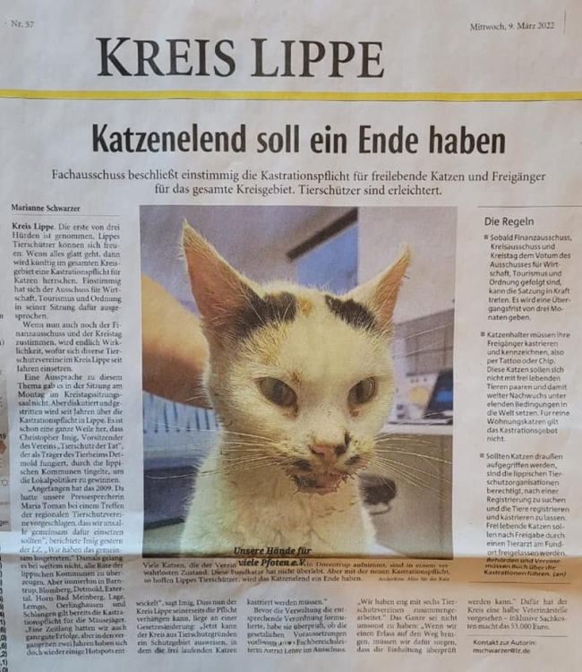 Die am 28. März 2022 im Kreistag beschlossene flächendeckende Verordnung gilt jetzt für ganz Lippe, und unsere sachliche Argumentation und hartnäckige Ausdauer haben zum Erfolg geführt - vor allem für die Katzen.