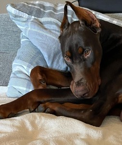 Der junge Dobermann Jens-Kevin kam im Dezember 2024 über die Behörde in unsere Obhut und wurde jetzt zur Vermittlung freigegeben.