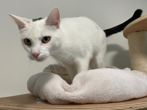 Die fast weiße Katze Darcy ist leider schon zum zweiten Mal aus der Vermittlung zurückgekommen. Ursprünglich wurde sie Sommer 2020 als Katzenkind gefunden und vermittelt. Zwei Jahre später wurde sie an uns zurückgegeben und fand erneut ein Zuhause, das sie nun aber auch wieder verloren hat, weil sie vom Nachbarkater dauernd verprügelt wurde.