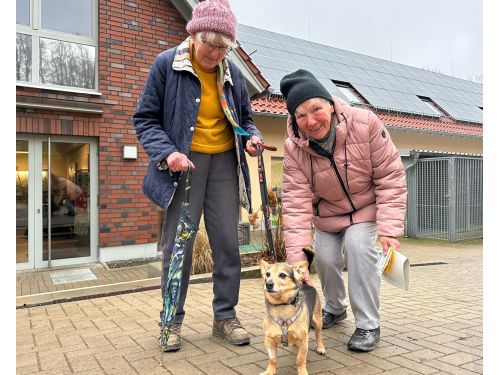 Senior Wolle ist zu einer rüstigen älteren Dame umgezogen und wurde – begleitet von ihrer Nachbarin – in sein neues Zuhause abgeholt.