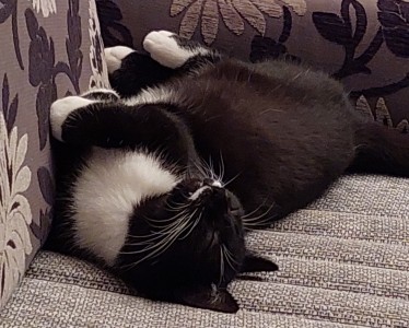 Stan ist jetzt zwei Wochen bei mir. Er hat sich sofort gut eingelebt. Tobt herum, putzt die Ecken, wo der Saugroboter nicht hinkommt (siehe Foto voller Spinnweben) und ist ein richtiger Schmusekater. Ich bin superglücklich, ihn adoptiert zu haben. Wenn es im März etwas wärmer wird, dann wagen wir uns in den Garten.