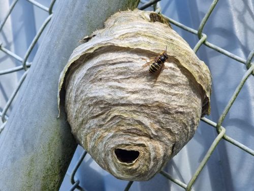 Ein Wespenvolk hatte sich vor kurzen im Tierheim zum Nestbau ausgerechnet das Gitter zwischen zwei unserer Hundegehege ausgesucht.