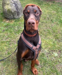 Der junge Dobermann Jens-Kevin kam im Dezember 2024 über die Behörde in unsere Obhut und wurde jetzt zur Vermittlung freigegeben.