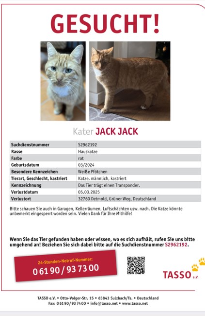 Hallo, wir vermissen schmerzlich unseren Kater Jack seit Mittwoch, den 05.03. Ist er evtl. bei euch abgegeben worden?