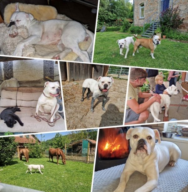 Zu den direkten Nachbarn hier auf dem Hof gehe ich so oft wie möglich, da gibt es meist Leckerlis für mich. Manchmal flitze ich heimlich rüber, da habe ich sie auch schonmal ganz schön erschreckt, als ich über die Terrasse reinkam. Das ist aber alles kein Problem hier. Einen Hundefreund gibt es auch in der direkten Nachbarschaft - einen Old English Bulldog-Rüden. Kinder, Katzen, Leute alles ist super. Auch Bürohund bin ich ab und zu.